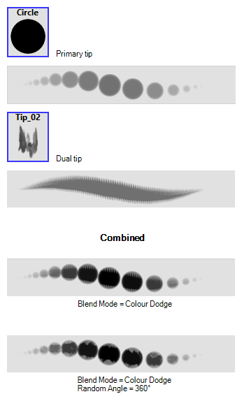 This is the default blend mode. When the two brush tips are combined in this mode, they essentially cut each other out in overlapping areas, where one or both tips have an area of 100% transparency. The less opaque the brush tips are, the lighter their combination.