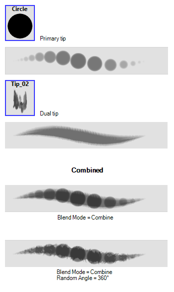 The Dual Tip tab lets you set the parameters for creating a dual tip brush. The primary bitmap brush tip and the dual tip always work together. You can set the parameters for the primary tip in the Tip tab and those for the dual tip in the Dual Tip tab. The Blend mode you select determines how the tips are combined.