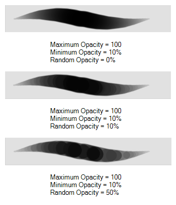 You can create variation in the opacity of your brush stroke just by setting the Maximum and Minimum Opacity values. If you add randomness to the mix, pressure sensitivity from your drawing tablet will still be applied. Light pressure will create random values around the minimum, while heavy pressure will create random values closer to the maximum. The larger the percentage, the larger the range of random variation.