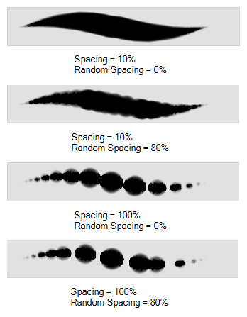 Defines the amount of space between each stamp of the brush. A value of 100% sets the stamp marks edge to edge, if there is no white space around the shape. The larger the value, the greater the space between marks. A really large value can make the brush stroke appear as a string of individual marks. Conversely, a small spacing value will give the appearance of a fluid brush stroke.