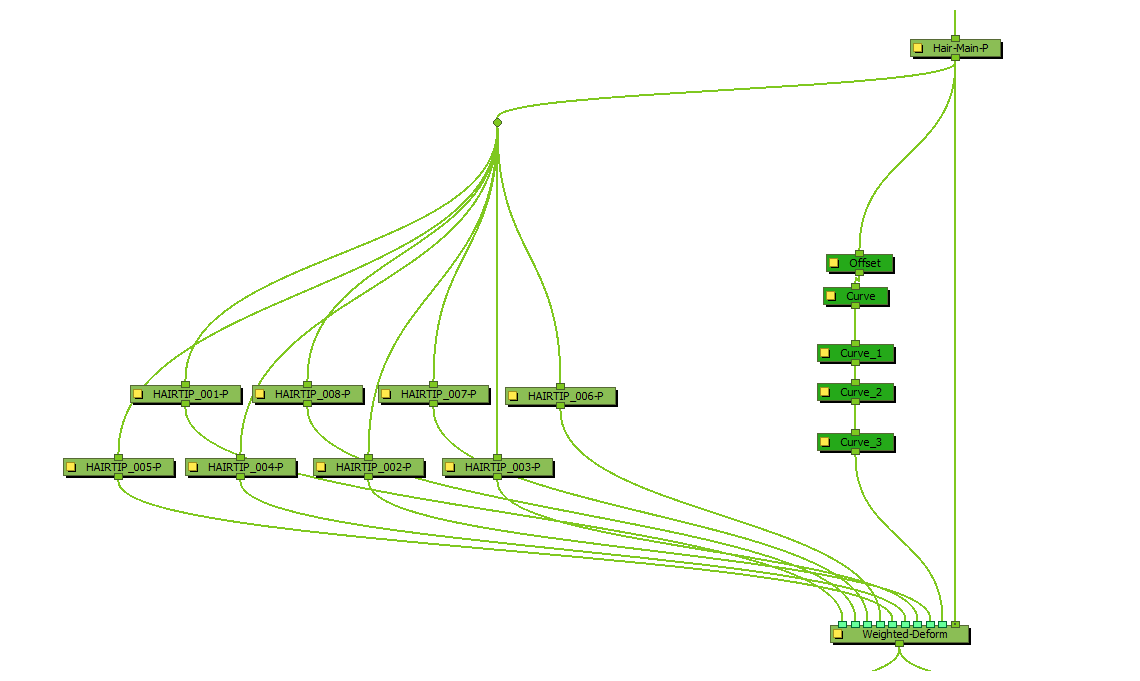 For example, if you rig fluffy hair with points to a Weighted Deform node, and add pegs to the Weighted Deform nodes so as to animate the individual points, you can rig Dynamic Spring nodes to each peg. The result is that, if you move the hair around in the scene, a follow through animation will be automatically generated, based on that movement, for the individual deformation point. The points will trail behind the rest of the hair, then overshoot, then settle, creating the illusion of realistic hair physics.