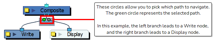 If a bottom port is connected to several nodes and you press the Down Arrow key, circles will appear to prompt you to select which node to navigate to: