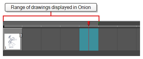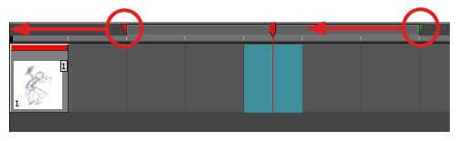 - In the Timeline view, click and drag on the red onion skin marker to make it include the previous drawings you want to display in the onion skin, then click and drag on the green onion skin marker to make it include the next drawings you want to display in the onion skin.