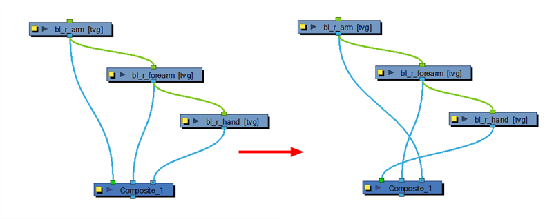 The Node view allows you to reorder layers without breaking any hierarchy. For example, if you want the Head layer to appear behind all the facial features, in the Timeline view, you cannot simply move the layer down because you will break the parenting between the head layers. In the Node view, since you have a set of flexible connections, you can change the Composite node ordering without breaking the parenting between the nodes.