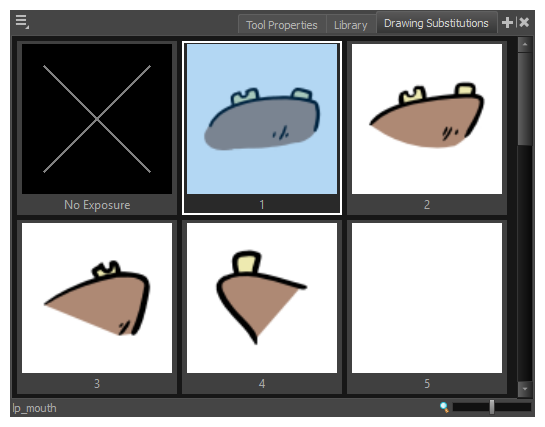 The Drawing Substitutions view is the easiest way to swap drawings. When you select a layer, the Drawing Substitutions view will display every drawing in that layer's element as thumbnails. All you have to do is select the frame where you want to swap drawings, then click on the thumbnail of the drawing you want to expose.