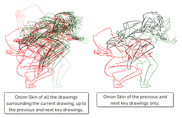 If you have a lot of drawings and only want to display certain kinds of drawings in the Onion Skin, you can make the Onion Skin only include drawings that have been marked as keyframes or breakdowns and ignore all the in-betweens. Likewise, you can also make the Onion Skin only display drawings that are not marked (in-betweens) and ignore key drawings and breakdowns.