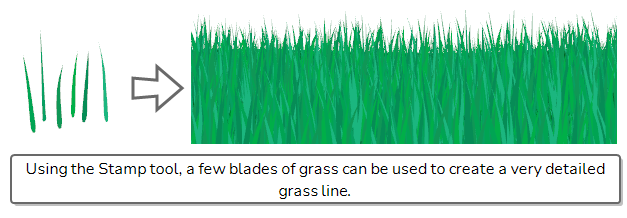 Other than being able to easily re-use drawings, The Stamp tool can be used to streamline drawing if you need to draw something that requires a lot of repetitive detail, such as starry skies, grass, weather conditions or particle-type effects. For example, a stamp made of a few different drawings of a blade of grass can be used to draw a grass line by drawing a few strokes of that stamp over the same horizontal line. The ability to randomize the size, angle and distance of the stamping can give the result of using this procedure a more natural look.