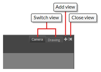 Each views has a tab on top of it which contains its name. Not only this can be used to identify the views you’re working with, tabs also allow you to stack several views in the same area of the user interface. For example, in the default workspace, most of the area is occupied by the Camera view. At the top of the camera view are two tabs, one that says Camera and the other that says Drawing. This is because the Drawing view is stacked with the Camera view, and you can quickly switch between both by clicking on either tab.