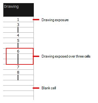 In the drawing columns, you can see the drawing names and their exposure. You can use any alphanumeric symbol to name your drawing. When a drawing is exposed over more than one cell, a vertical black line is displayed to indicate the continuity of the exposure. When there is no drawing in a cell, the cell will be blank.