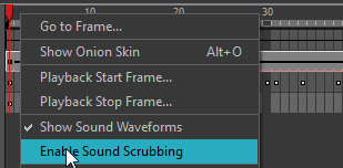 | ‣ | Right-click in the frame bar of the Timeline view and select Play > Enable Sound Scrubbing. |