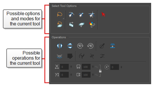For example, if you choose the Select tool, the Tool Properties view will display the options and operations related to it, such as Snap to Contour, Apply to All Drawings, Flip Horizontal, and Flatten.