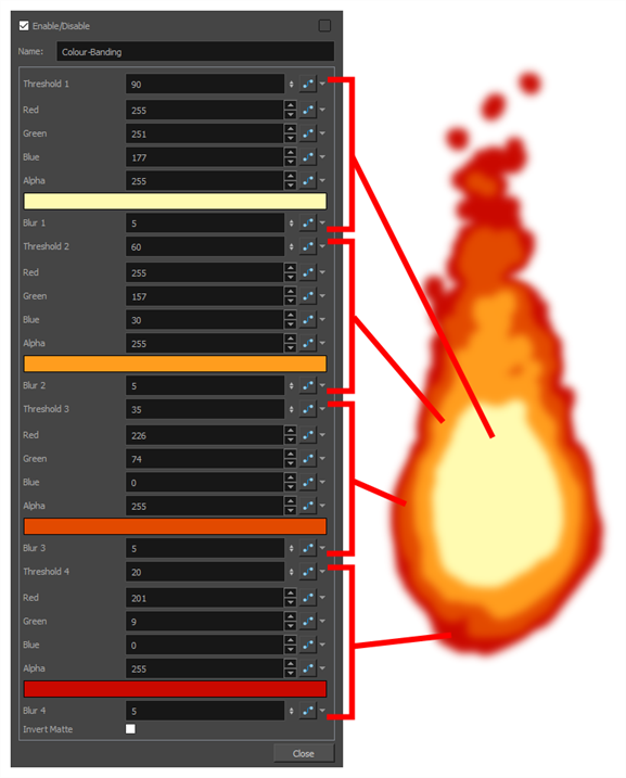 Use the Colour Banding effect to add a colour banding visual effect to your elements. The node will associate a flat colour to the different regions of your element. These regions are delimited according the alpha values that are set up in the effect node and which will be recognized on the original element. You can use this effect to change the visual style of a particle node, for example, by giving it a more cartoonish look.