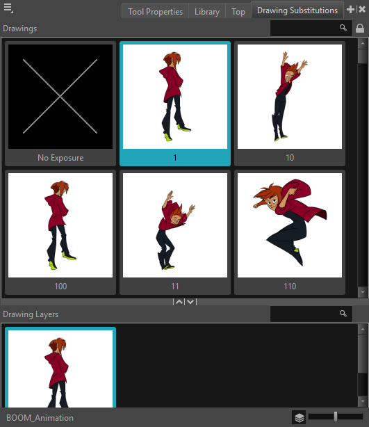 The Drawing Layer Substitution view displays all the layers contained in an element from the Drawing Substitution view. Each layer will appear as a separate thumbnail in the Drawing Layer Substitution view. From this view you will be able to swap both the drawing and/or its layers on the timeline. All you have to do is select the frame where you want to swap drawings, click on the layer thumbnail of the drawing you want to expose .