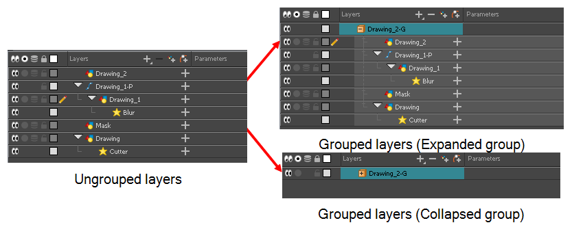 When working with complex rigs, you may want to group layers together to avoid cluttering the Timeline view and keep your layers organized.