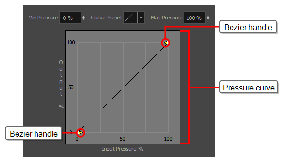 This curve determines how to process the amount of pressure you apply to your tablet pen into your drawing tool's size. By default, it is linear, meaning that the amount of pressure you put on your tablet pen is directly applied to the size of your drawing tool. By moving the two Bezier handles between the extremities of the curve, you can change the curve's shape.
