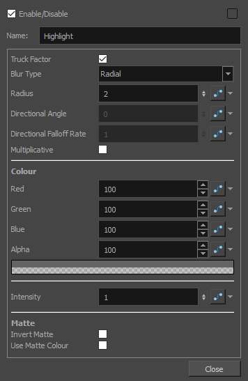 Instead of using the colour in the Colour parameters, this uses the colours in the matte drawing to generate the effect. NOTE The effect of this parameter is only visible in Render View