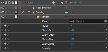 The Highlight effect layer must be connected as a child of the drawing layer or group which you want it to affect, and must have a matte drawing layer or group added to its Matte attribute. The part of its parent image that are covered by the matte drawing will have a highlight applied to it.