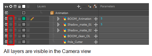 • Single-clicking a layer's colour swatch toggles Outline mode on or off. Outline mode makes the layer display as nothing but the outlines of its vector shapes in the Camera view, allowing you to see the drawing's shape without it blocking the view of layers behind it.