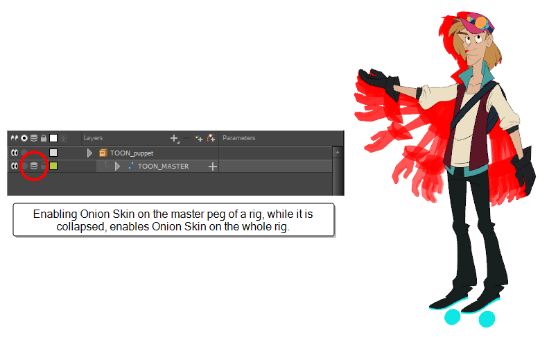 Also, and perhaps more importantly, when a peg that is the parent of one or several drawing layers is collapsed, it also has an Onion Skin button. Clicking on this button will toggle Onion Skin on every drawing layer rigged under that peg. This allows you to quickly enable Onion Skin on your whole rig or on a large part of your rig.