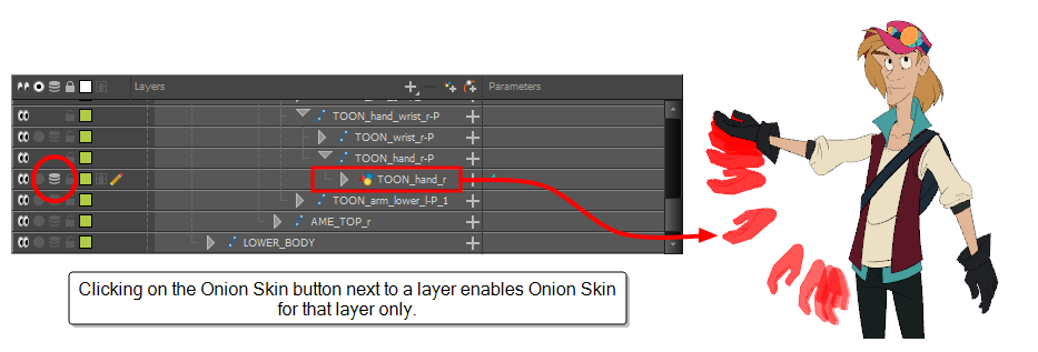 This makes managing Onion Skin while doing cut-out animation relatively seamless. However, you may still want to manage which layers are visible in the Onion Skin. For example, you may want to add more layers to the Onion Skin as their position is needed to help you pose specific layers, or you may want to remove layers from the Onion Skin to de-clutter it, or prevent it from hindering software performance. There are several techniques for managing which layers are displayed in the Onion Skin.