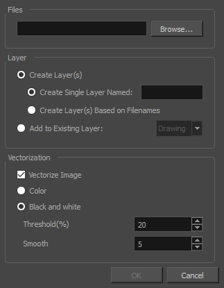 - Add to Existing Layer: Imports the images into the specified layer. Note that you can only import into layers that are compatible with your import options. For example, if you're importing images as vector drawings, you can only import them into vector drawing layers.