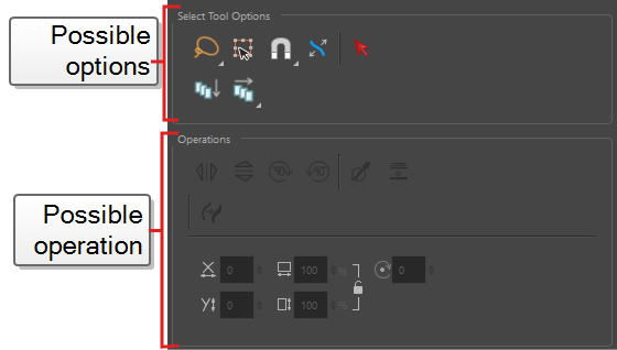 For example, if you choose the Select tool, the Tool Properties view will display the options and operations related to it, such as Snap to Contour, Apply to All Drawings, Flip Horizontal, and Flatten.