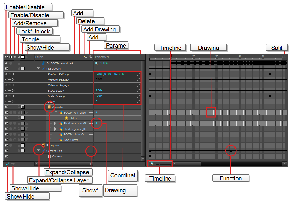 Contrary to the Timeline view, the Xsheet view does not display pegs, effects or layer hierarchy. Hence, it is optimized for traditional and paperless animation, whereas the Timeline view is optimized for digital or cut-out animation.