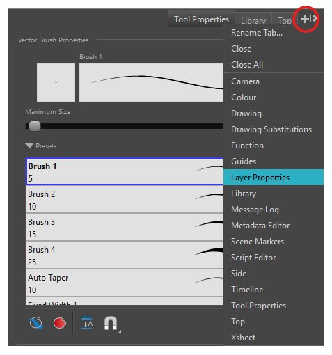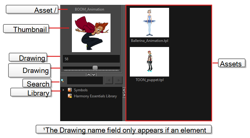 The Library view is used to store elements such as animation, drawings, backgrounds and character models so as to reuse in different scenes and projects. You can also use the Library view to create and store symbols, as well as to store and import images and sound files.