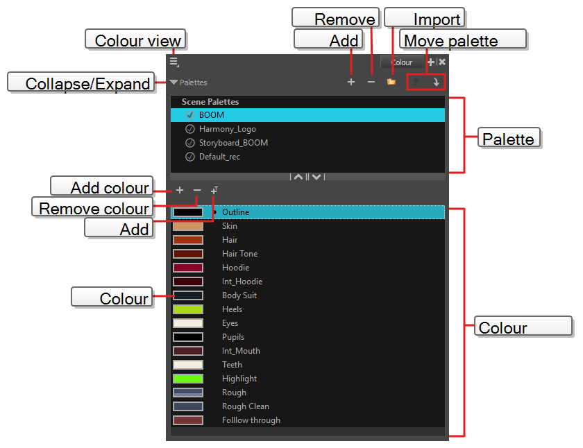 The Colour view is where you create colours and palettes and import existing palettes into your project. The Colour view is also necessary for drawing, painting and creating colour styling.