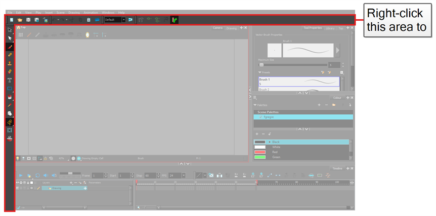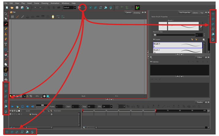 The Camera view is the centre of operations in Harmony. In this view, you can draw, paint, animate, set up your scene, manipulate objects, open symbols and preview your animation.