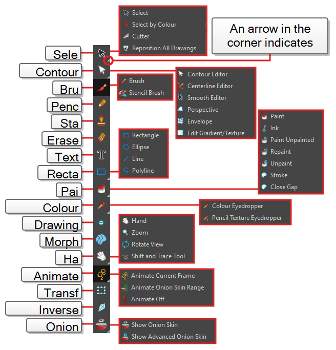 Some of the buttons in the Tools toolbar have a triangle in their bottom-right corner. This is to indicate that several tools are stacked on this button. To access these tools, either click and hold on the tool button, or select the tool then click on it again.