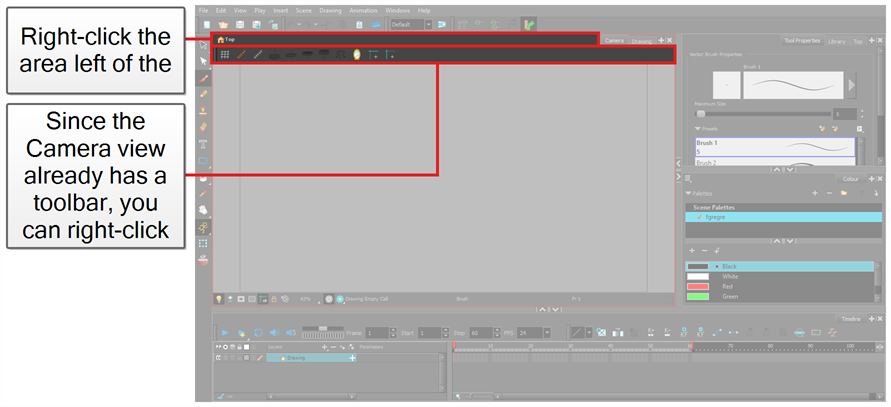 In Harmony, you can draw in both the Drawing or Camera views. Although the two views are similar, there are some differences when it comes to drawing.