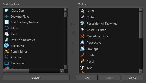 The Tools toolbar contains the main tools you need to work in Harmony. In the default workspace, this toolbar located on the left edge of the application window.
