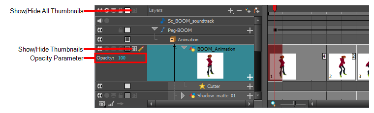 A drawing layer's opacity parameter will appear in the Timeline view when this drawing layer has thumbnails display enabled: