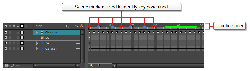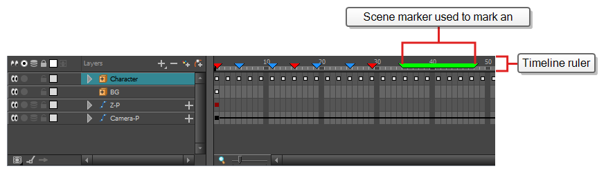 You can use scene markers to highlight, sort and label parts of your scene. For example, you can indicate the frames you want to clean up, a change in action, an impact, or where you intend to apply an effect.