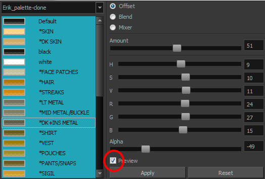 You can use the Tint Panel dialog to offset, blend or mix all the different colour swatches in a palette simultaneously. This can be useful if you want to give a cloned palette a different tint, for example to make a night-themed version of a character's master palette.