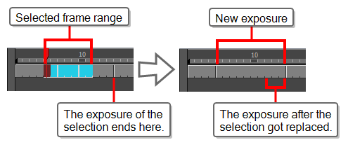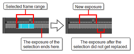 If you select a range of frames in the Timeline view, then use the Parameters column to swap drawings, the every frame in the selected range will be replaced with the new drawing up and until the end of the last exposure in the selection.