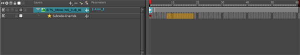 If your 3D model already contains a Subnode Override node in the Node view, you can drag and drop your 3D animation layer directly into the Timeline from the Drawing Layer Substitution view. You can drop the animation keyframes directly onto the Subnode Override layer.