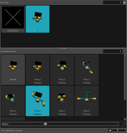 The Drawing Layer Substitution view displays all the layers contained in an element from the Drawing Substitution view. Each layer will appear as a separate thumbnail in the Drawing Layer Substitution view. From this view you will be able to swap both the drawing and/or its layers on the timeline. All you have to do is select the frame where you want to swap drawings, click on the layer thumbnail of the drawing you want to expose