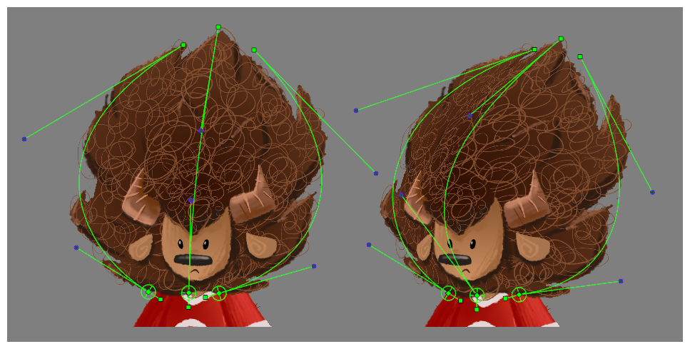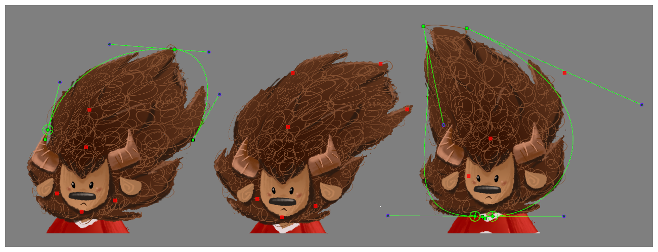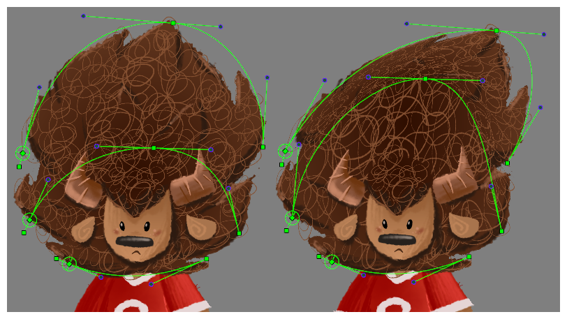 Weighted deformations can be used to define and deform regions. This is useful for designs with a high level of detail. In this case, it helps to create volume by deforming along the axis lines of the hair and blending between the deformation regions.