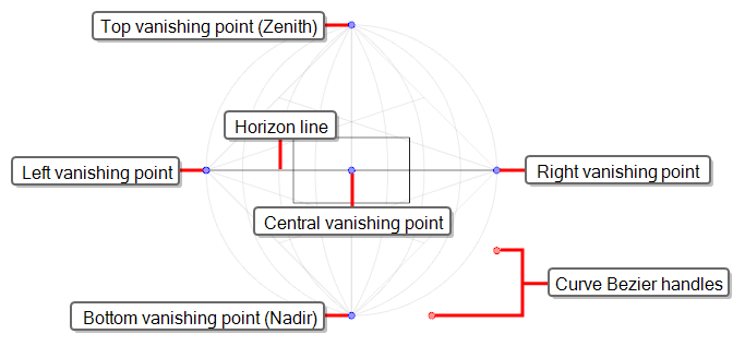 The 4-Points Perspective (Vertical Pan) guide helps you draw backgrounds and objects with perspective from an angle with curvilinear vertical lines. It provides a horizon line on which there are two vanishing points, one for drawing lines on the x-axis and the other for drawing lines on the z-axis. There are two more vanishing points above and below the horizon line, used to draw curvilinear vertical lines.