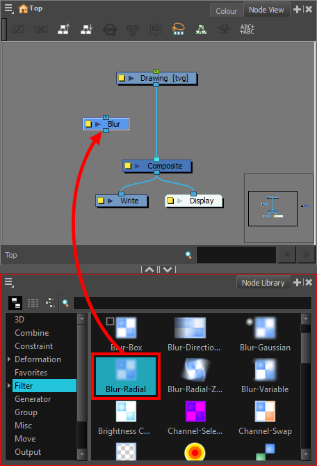 In the Node Library view, select an effect and drag it to the Node view. You can use the Search toolbar to find nodes quicker.