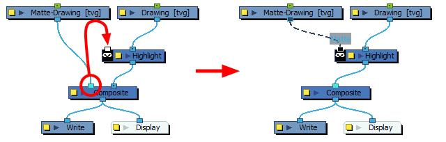 While holding the Alt key, move the Highlight node over the cable connecting the drawing to your scene's main composite. The Highlight node will become connected as an intermediary between the drawing and its composite.