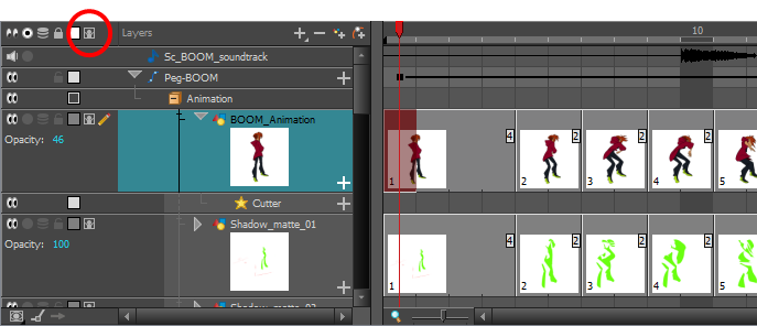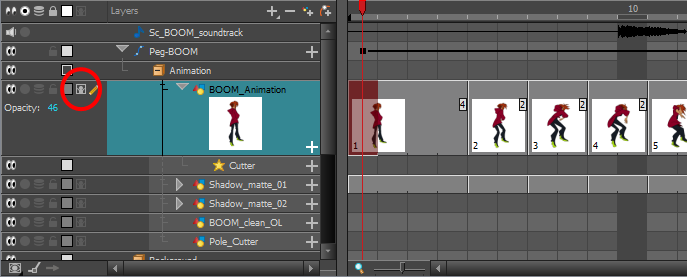 You can enable Thumbnails for all drawing layers simultaneously or for individual drawing layers. When thumbnails are displayed for a layer, the Timeline view also displays the name of each drawing as well as the amount of frames on which each drawing is exposed for that layer. Enabling thumbnails on a layer also gives access to that layer's Opacity parameter in the left panel of the Timeline view.