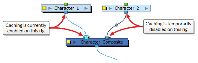 When an element or a rig is cached, it cannot be interacted with directly without temporarily disabling its cache first. Hence, project collaborators who must work with cached nodes and rigs must learn how to temporarily disable caching on elements and rigs they are working on.