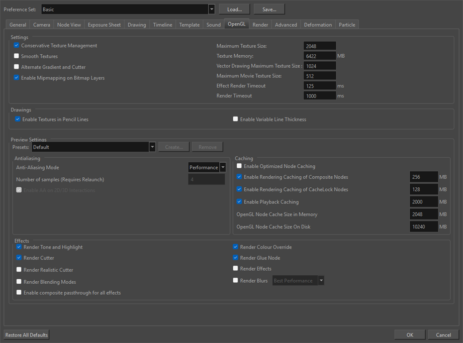 Render Blending Modes: When enabled, the Camera view in OpenGL will show a preview of the blending mode applied to your image from the Blending node in real time similar to how it will appear in the final rendered. Render Composite Passthrough for All Effects: When this option is enabled, effects that display in the OpenGL preview are ordered based on the logic that will be used for the final rendered image, which may fix some issues with the OpenGL preview when using complex node systems comprised of effects and mattes. However, enabling this option may impact performance if the scene has effects that use a matte, such as the Cutter or Tone effect. Render Colour Override: Controls whether Colour-Override effects are rendered in the OpenGL preview. Render Glue Node: Controls whether Glue effects are rendered in the OpenGL preview. Render Effects: When enabled, the Camera view in OpenGL will show a preview of the applied effects in real time similar to how it will appear in the final rendered image at soft-render. IMPORTANT Only effects supported by the Camera view in OpenGL will preview as in the soft render.