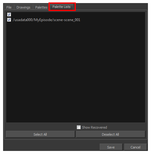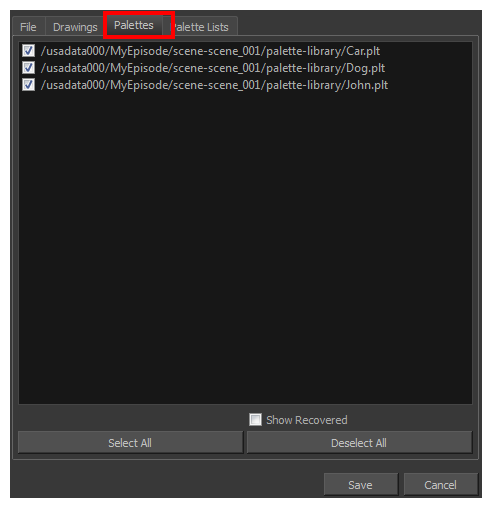 Deselect the Save option if you only want to save specific components of your scene listed in the Drawings, Palettes or Palette Lists tabs. This will disable all option in the File tab.