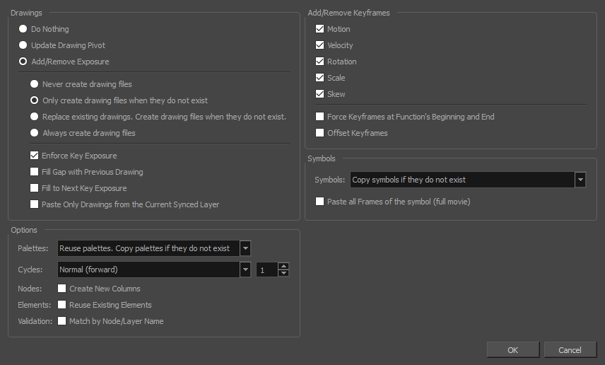 | Enforce Key Exposure: If there are key exposures that exist on copied drawings, they are preserved when pasting. No key exposures are added. This is the default behavior when pasting. | |