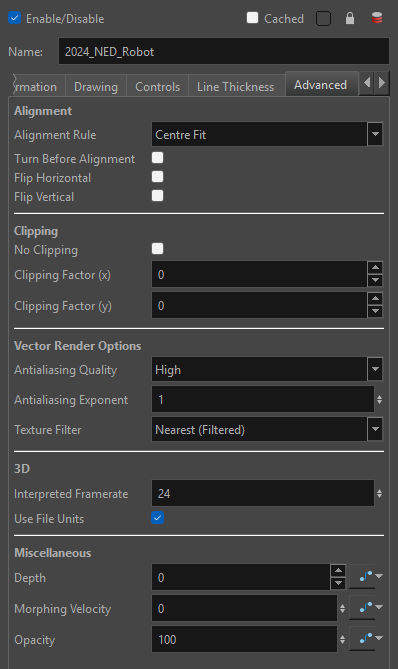 Depth: Overrides the order of cables in the node system to determine the forward/backward order in which this element is rendered. The Z position value overrides the depth value. Morphing Velocity: When morphing drawings in the element using the Morphing tool, this parameter can be used to create or select the velocity function used to determine the pace of the morphing animation. Opacity: Lets you quickly change the transparency of the selected element. Opacity settings here will be reflected in both OpenGL preview, and full render. |