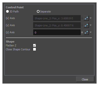 This option is useful for the last point in a chain of Shape Line or Shape Curve nodes. The nodes that are chained together are automatically linked by a contour, but the first and last nodes are not linked by a contour by default. Enable this option on the last point in the chain to create and contour between the first and last point in the chain and make a closed shape. |